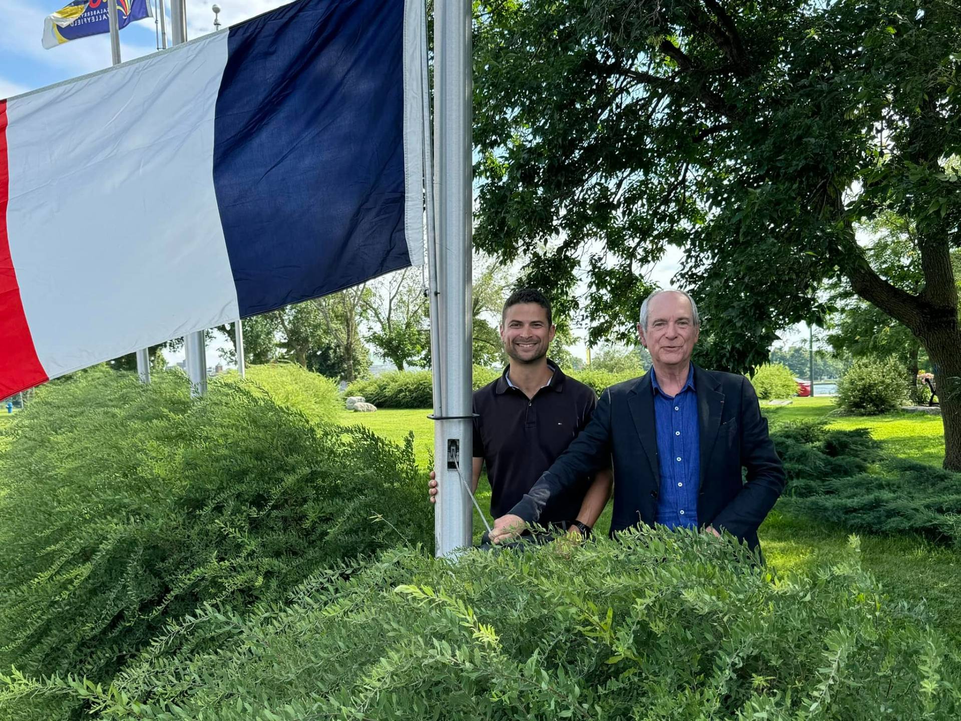 Le maire Miguel Lemieux a hissé le drapeau français à l’un des mâts de l’Avenue du centenaire en compagnie du maire de Combs-la-Ville, Guy Geoffroy. (Photo Ville de Salaberry-de-Valleyfield)