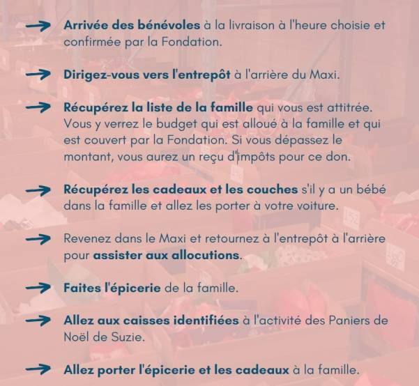 Les 20 bénévoles recherchés viendront au Maxi de Pincourt le matin du 14 décembre afin de faire l’épicerie selon les choix des familles (avec un budget octroyé par la Fondation), et feront la livraison avec les cadeaux aux enfants. Sinon, ces familles auront des cartes-cadeaux.