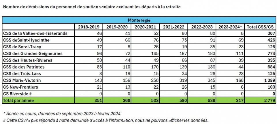 Depuis 5 ans, on a enregistré plus de 2700 démissions au sein du personnel de soutien scolaire en Montérégie, excluant les départs à la retraite (voir tableau), dont 125 au CSS des Trois-Lacs, 307 au CSS de la Vallée-des-Tisserands et 103 à la Commission scolaire New-Frontiers.